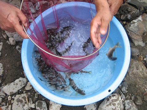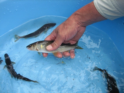 今年初めて世金水産(湖産)の稚鮎をこの付近に放流されました。