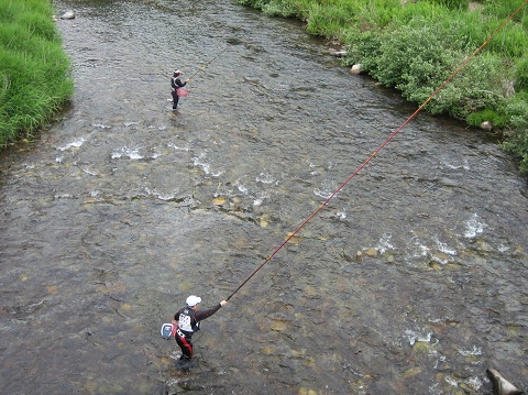 2人1組で、上流部と下流部(支流を含む)に分かれての釣行です。